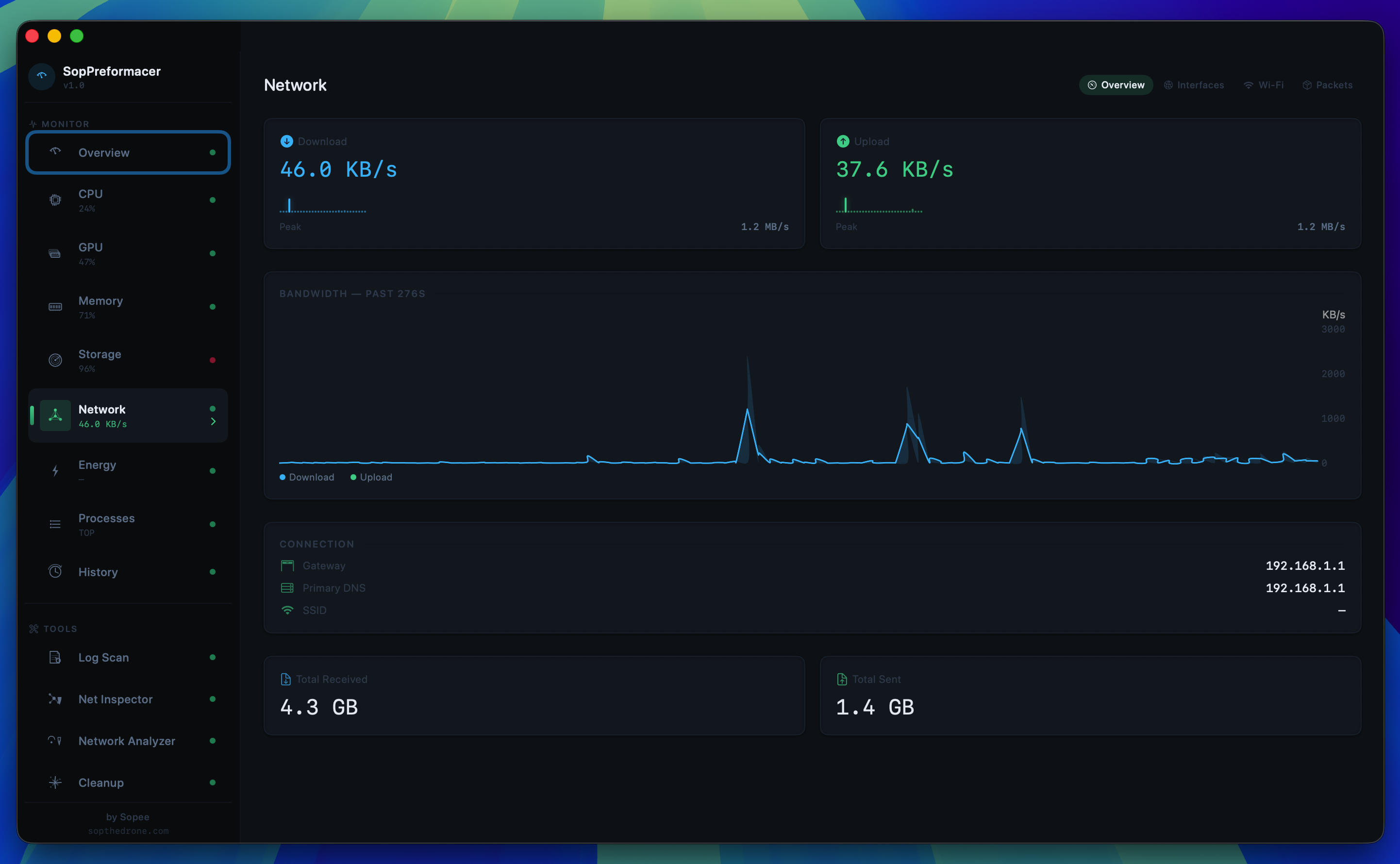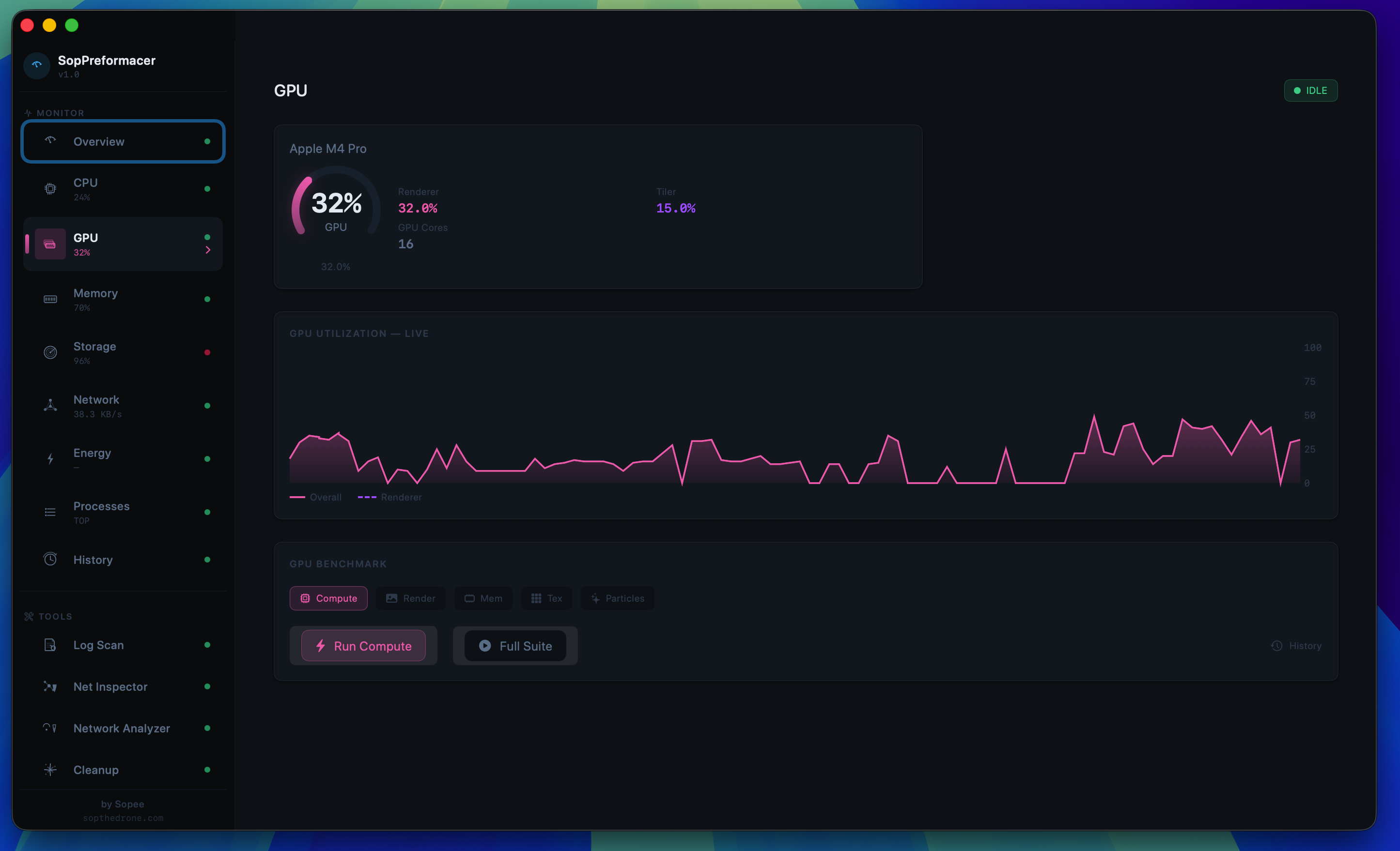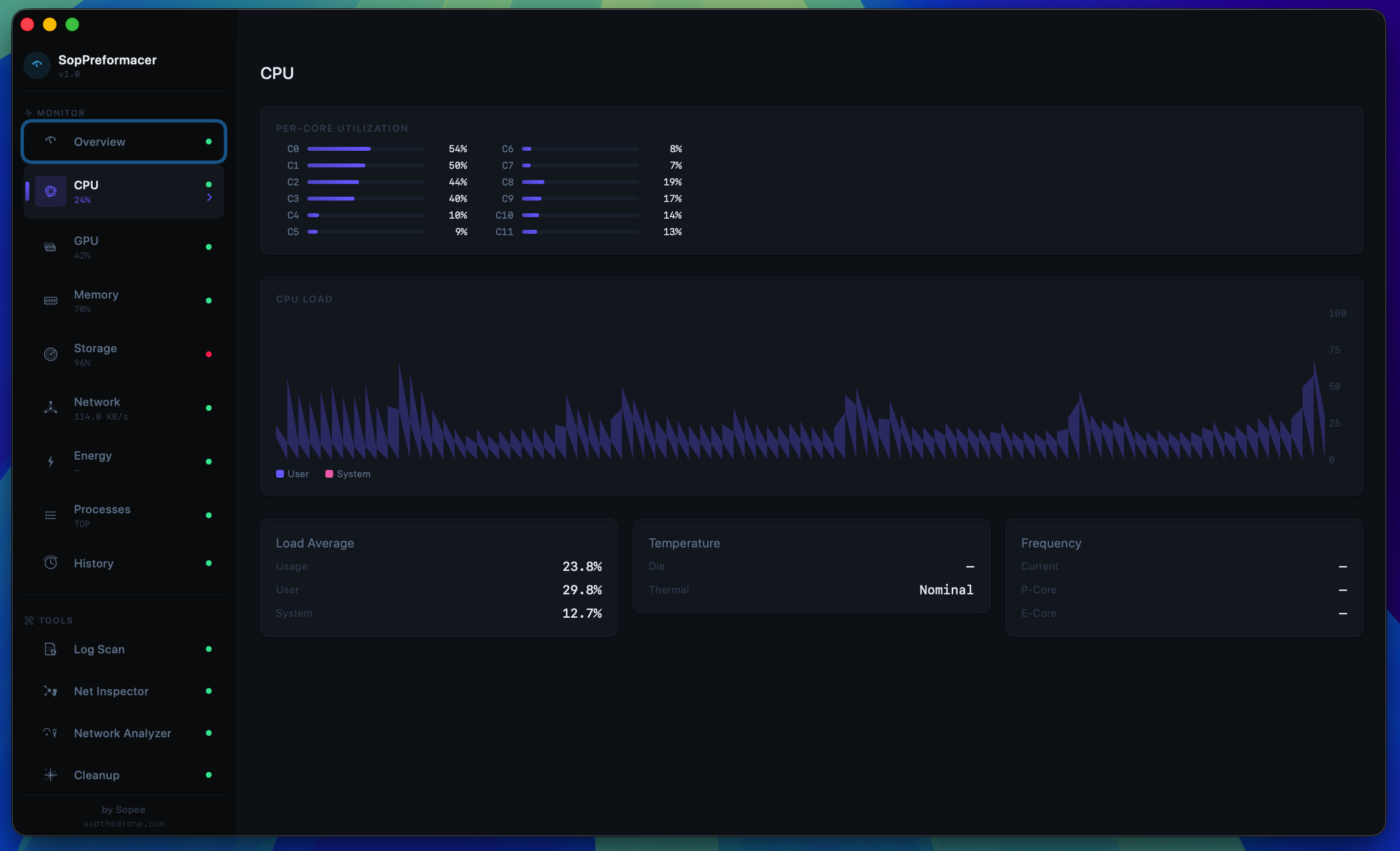 SopPreformacer is built as a complete Mac performance toolkit. You can move from quick health checks to deep diagnostics, cleanup actions, historical analysis, and AI-assisted troubleshooting without hopping between apps.